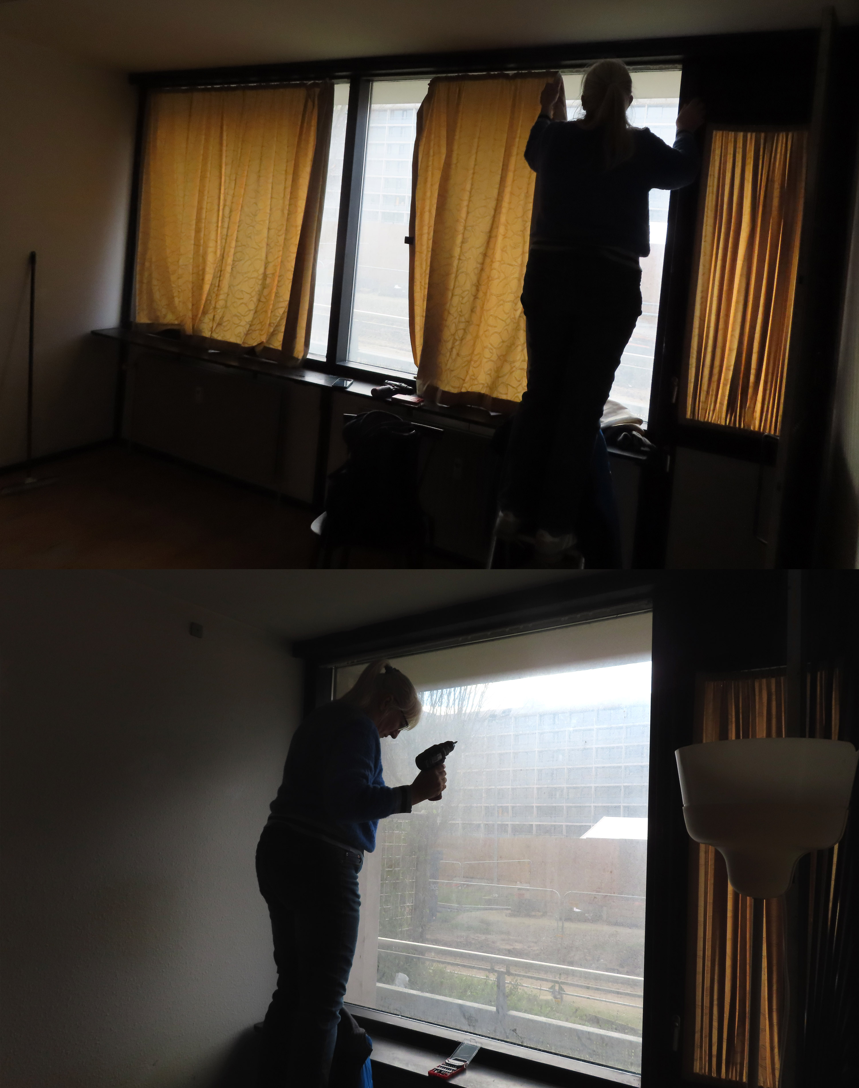 Helle and I went back up to the apartment and then we took the curtains down. Helle brought a screwing machine. Wait, that’s probably not how you say that in English…