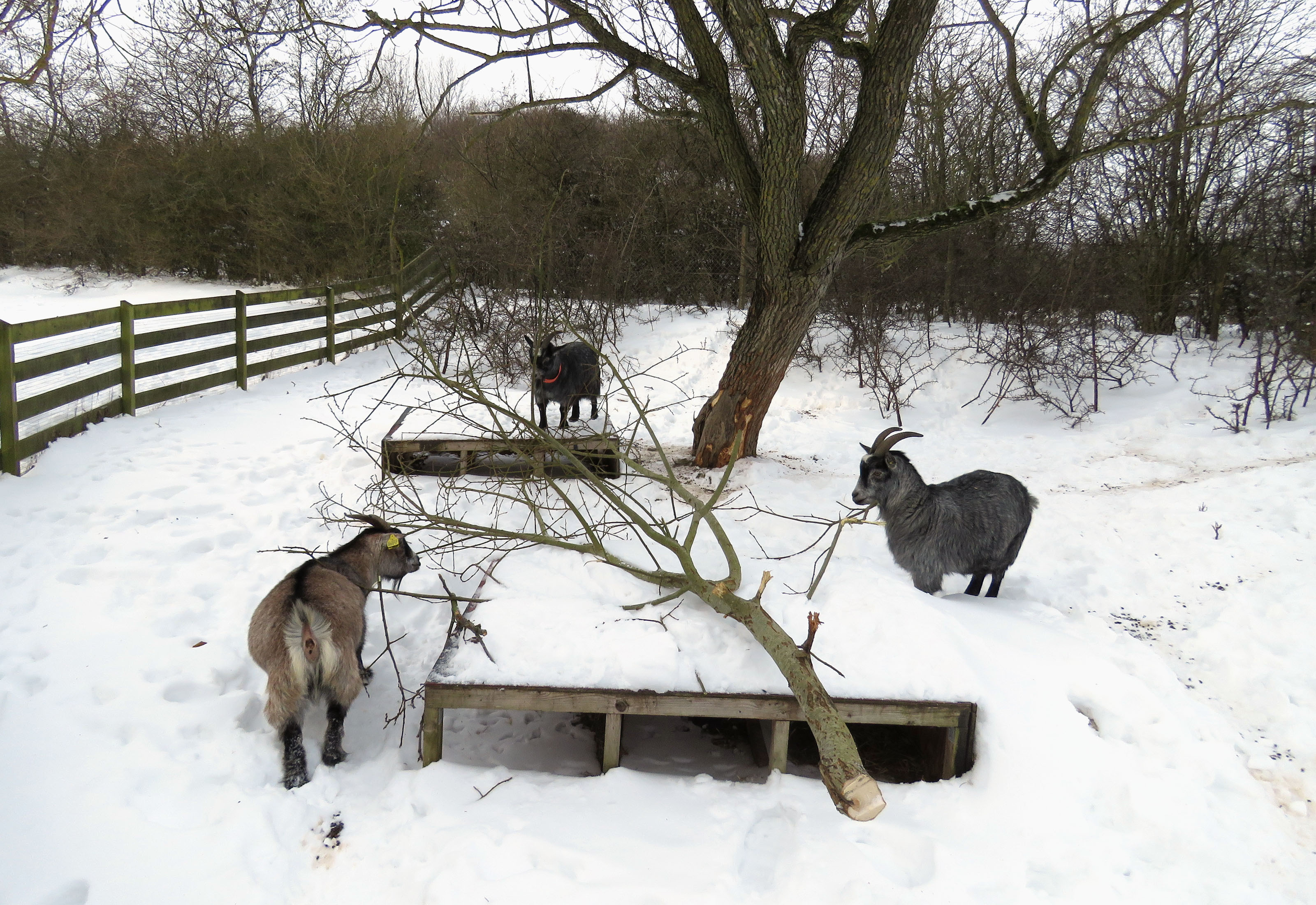 Three little goats relaxing in the sunshine. It’s nice to see them wanting to go into the pen again, instead of me having to lure them down there.