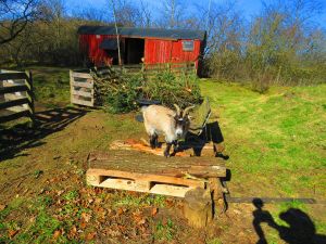 So I got that rebuilt. And the new build is better. The bigger pallet means the logs are more secured, and the elevation is higher. A good thing for goats to jump on. So I’m happy about that.
