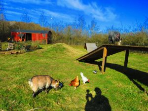 Here’s what I worked on today. It’s just an extension of the deck outside the goat shaft. The board on the left. Bella is inspecting. A little more space to stand on,,especially for Sky under the half roof when it rains.