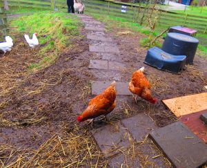 Some of the feathers. We have 5 now. The two whites are Italians. Jeanette told me she is calling them Diva and Donna. The two brown ones are both called Isa because they are apparently impossible to tell apart. I’ll take her word for that. She told me they got their name from Isa Brown, which I thought was some pop star, but looking it up it turns out to be a race of feathers. And then there’s the last one, must be the one not in this picture. She’s a Sussex, so I think she’s called Susie. I’m not going to be remembering any of this. I just hope they get to stay out with us.
